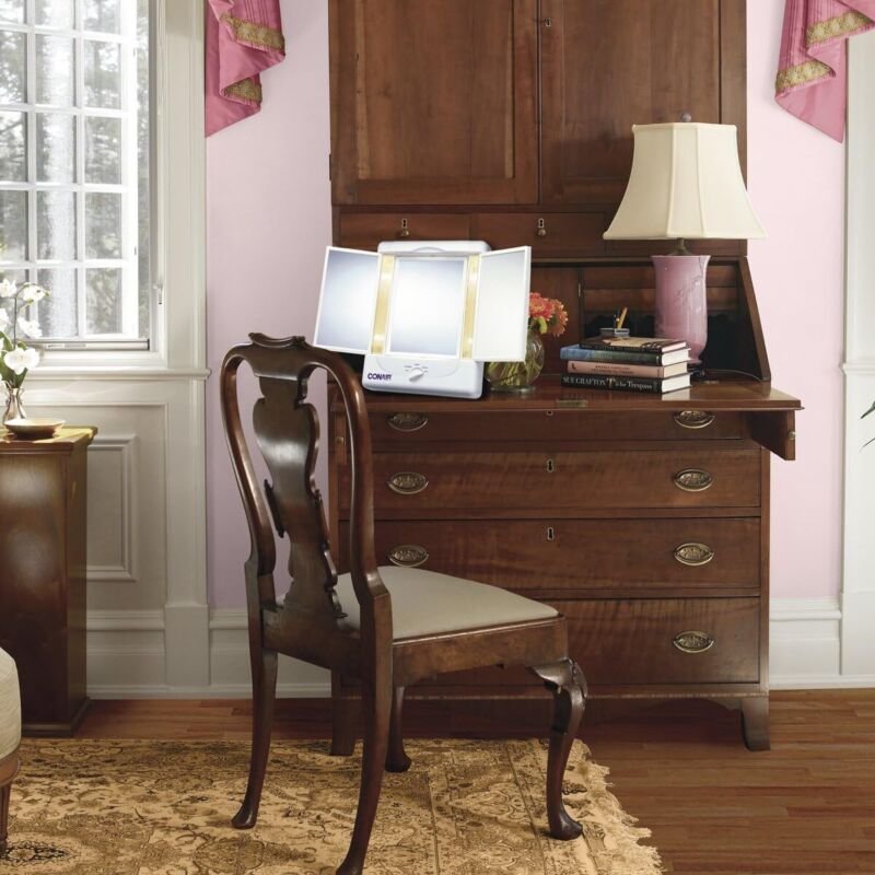 The beauty of this mirror comes with 4 light settings simulating evening, day, home, and office light, and 3 panels for wide angle viewing.