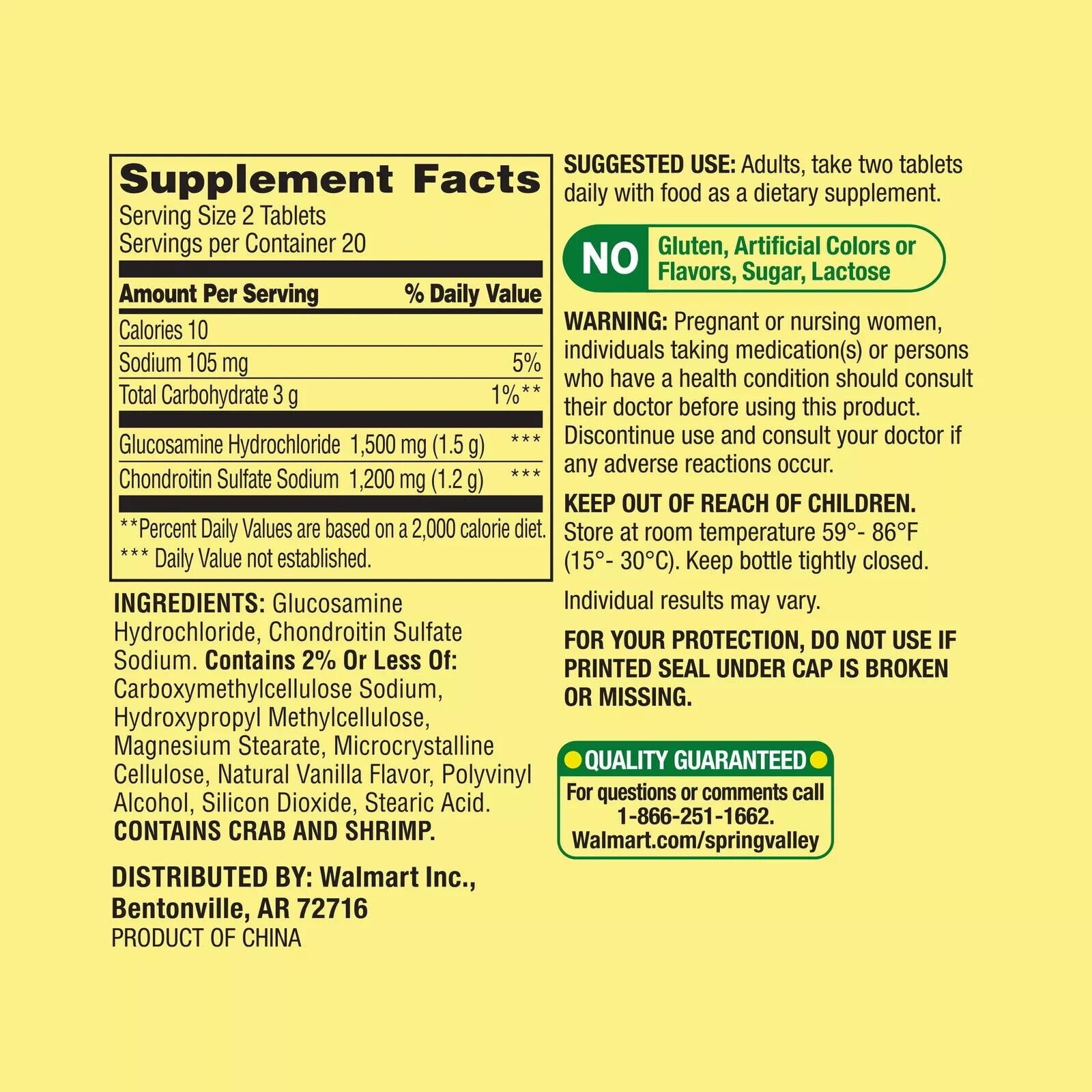 Our Spring Valley Triple Strength Glucosamine Chondroitin Tablets Dietary Supplement is formulated to support joint health.* Each serving of this triple strength formula delivers 1,400 mg of glucosamine and 1,200 mg of chondroitin. Glucosamine and chondroitin provide nutritional support for connective tissues and may promote joint health and comfort.* The suggested adult dosage is two tablets daily, preferably with a meal. These tablets are free from gluten, artificial colors, artificial flavors, sugar, and lactose. You can rest assured that Spring Valley Triple Strength Glucosamine Chondroitin Tablets Dietary Supplement is produced with strict quality guidelines and is backed by our quality guarantee.