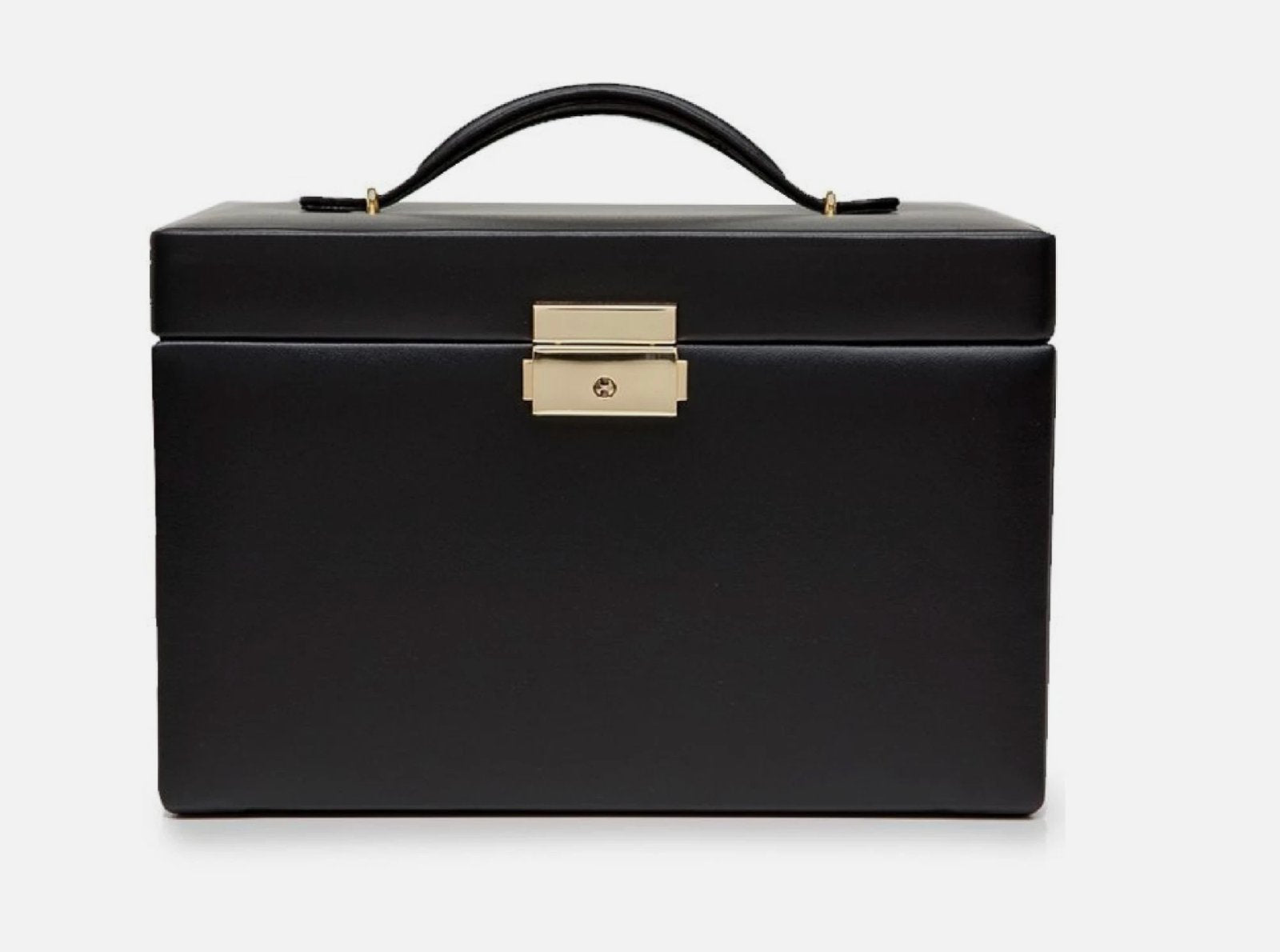 WOLF Heritage Small Jewelry Box, Black - 10 Compartments & Seven Ring Rolls - Includes Travel CaseAbout this itemJEWELRY BOX - This case combines classic style with functional design. It includes 10 compartments, seven ring rolls, a glass mirror, and a lock & key.